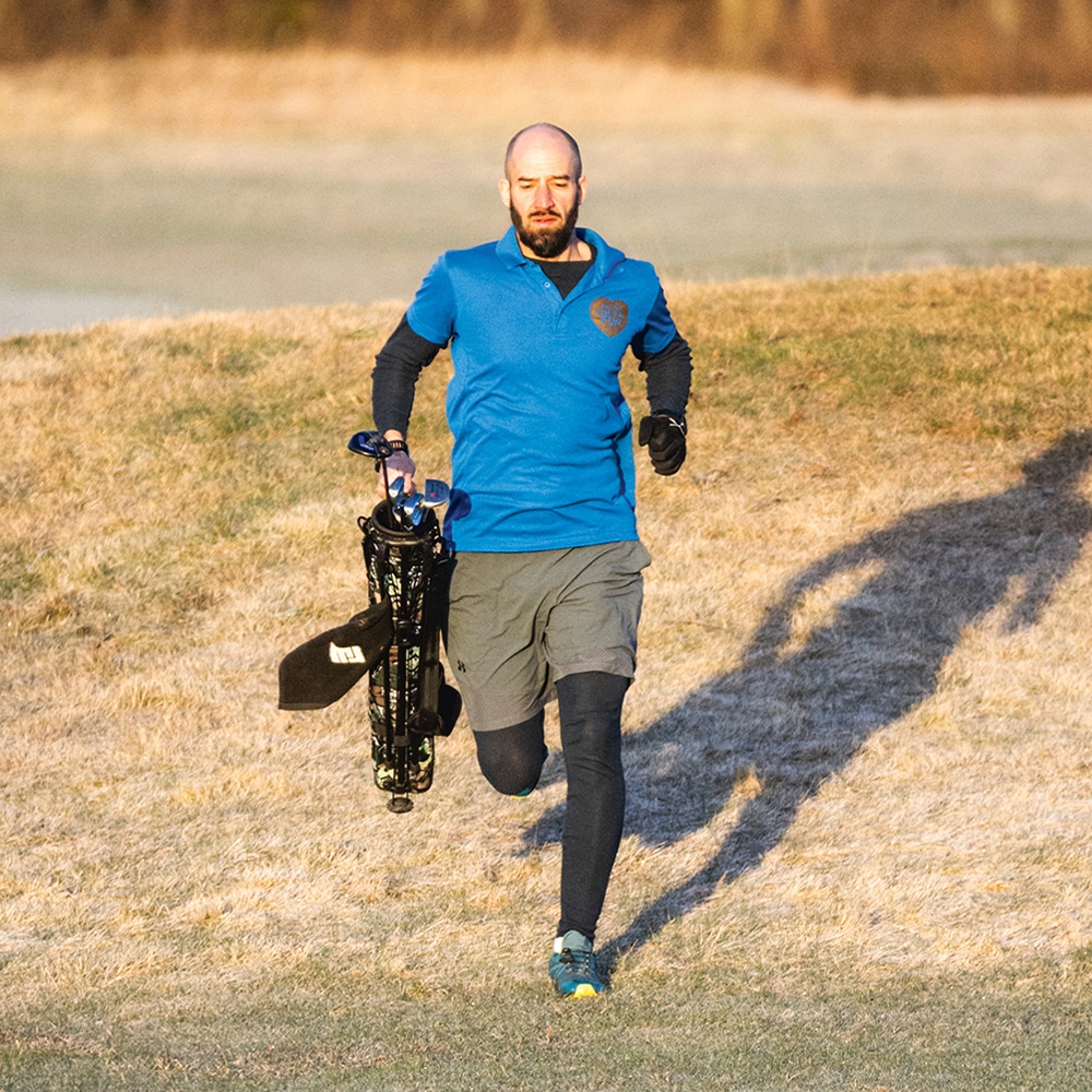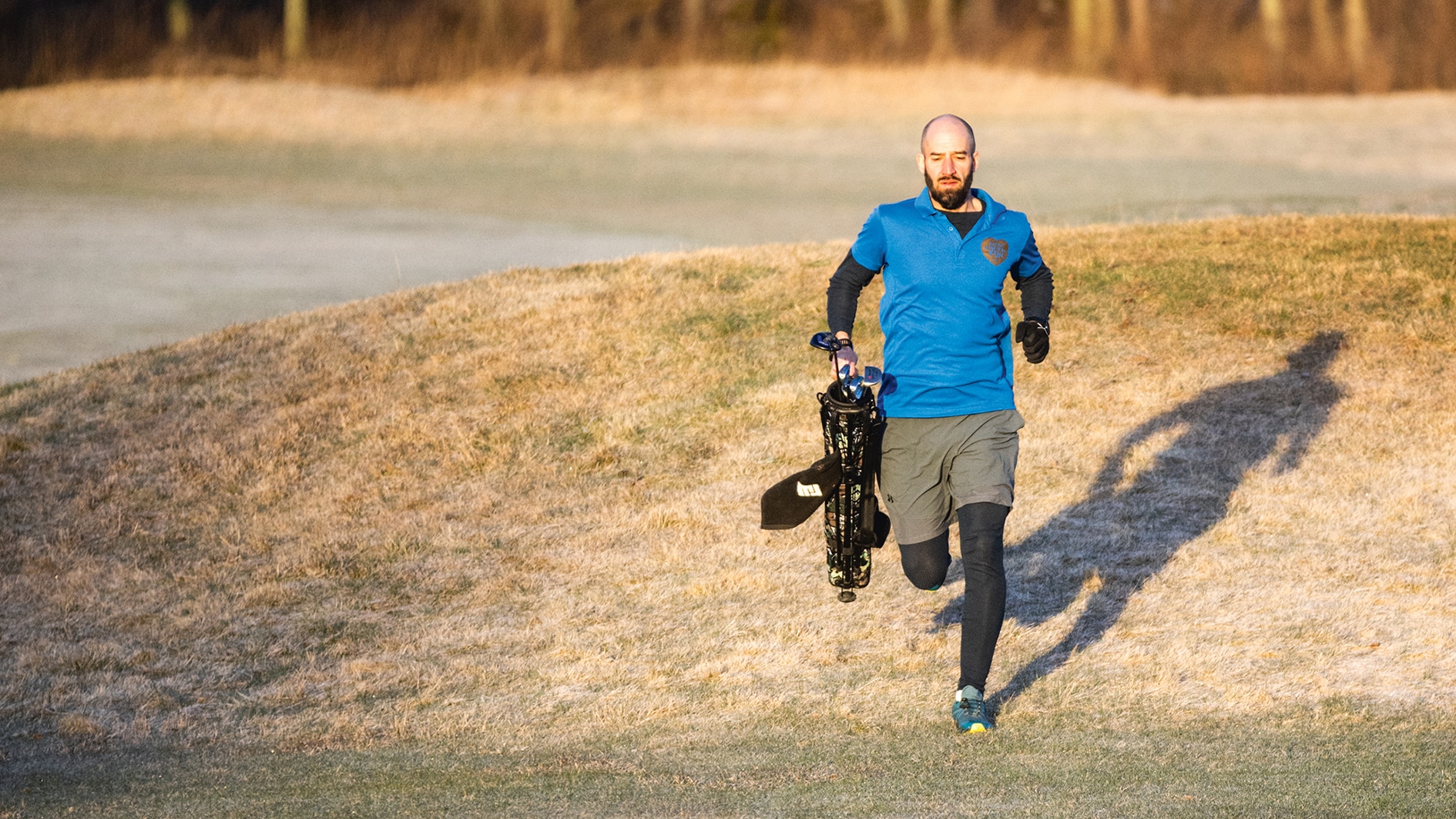 Kungsängen GK, 08:00 Kristoffer Lindén slår ut från första tee. I stället för att sedan promenera mot sin boll sprintar han i full fart. I handen har han en liten bag med fem klubbor.