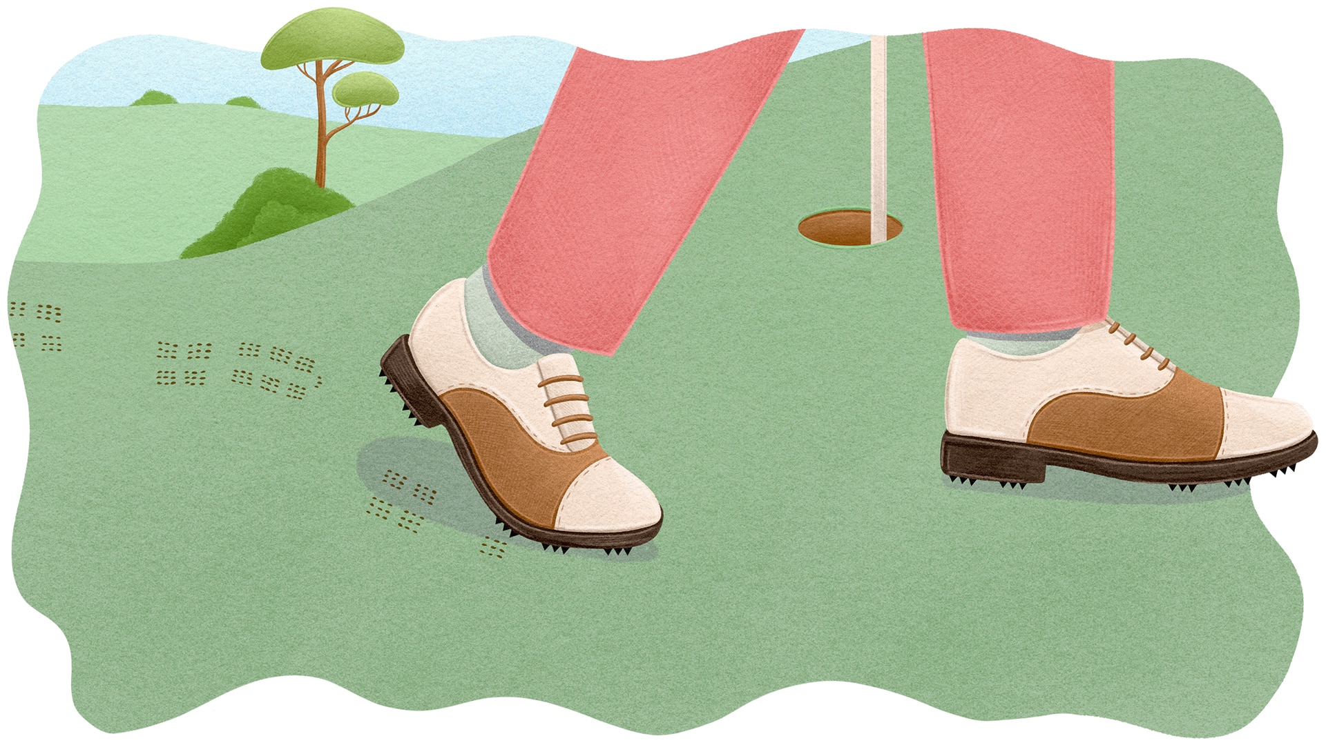 Ingen gillar att missa en viktig putt på grund av märken som orsakats av oförsiktiga steg på green. Linjen från boll till hål på green är “helig”, undvik att trampa i den.