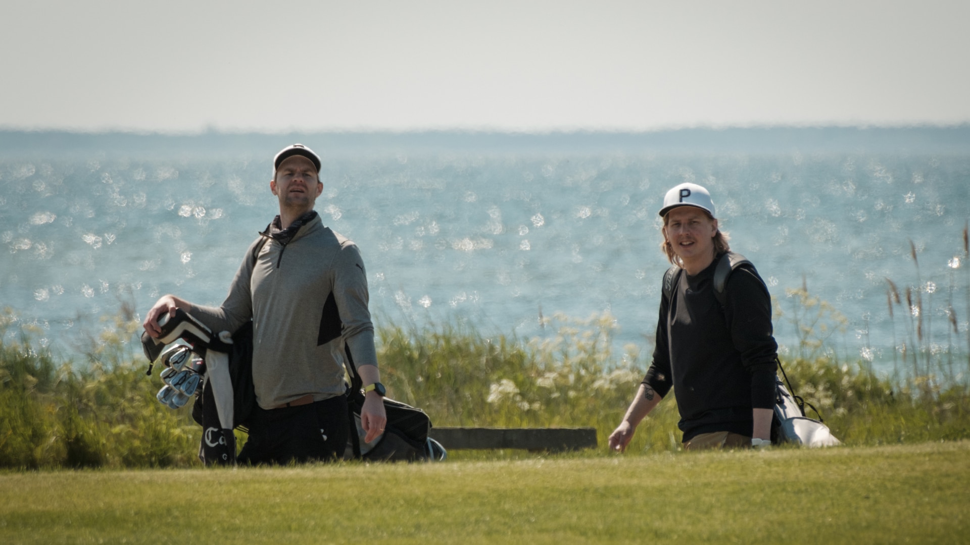 Anders Almgren (höger i bild) spelar gärna från främre tee eftersom han tycker att han kan spela jämnare och njuta mer av ronden. Som här på Visby Golfklubb. Foto: Stefan Schnöpf