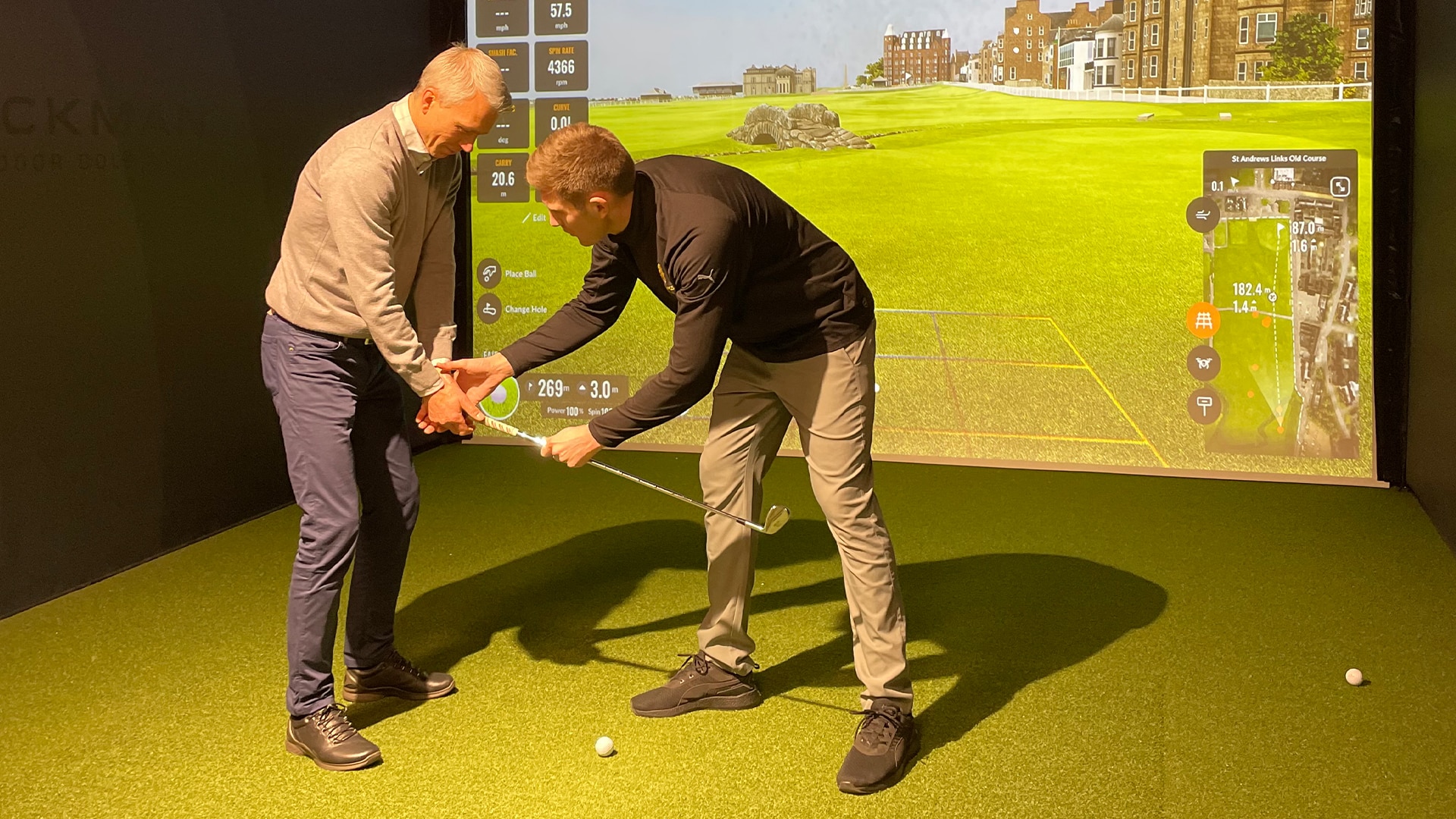 PGA-tränaren Filip Oesten instruerar en av klubbens spelare i studion.