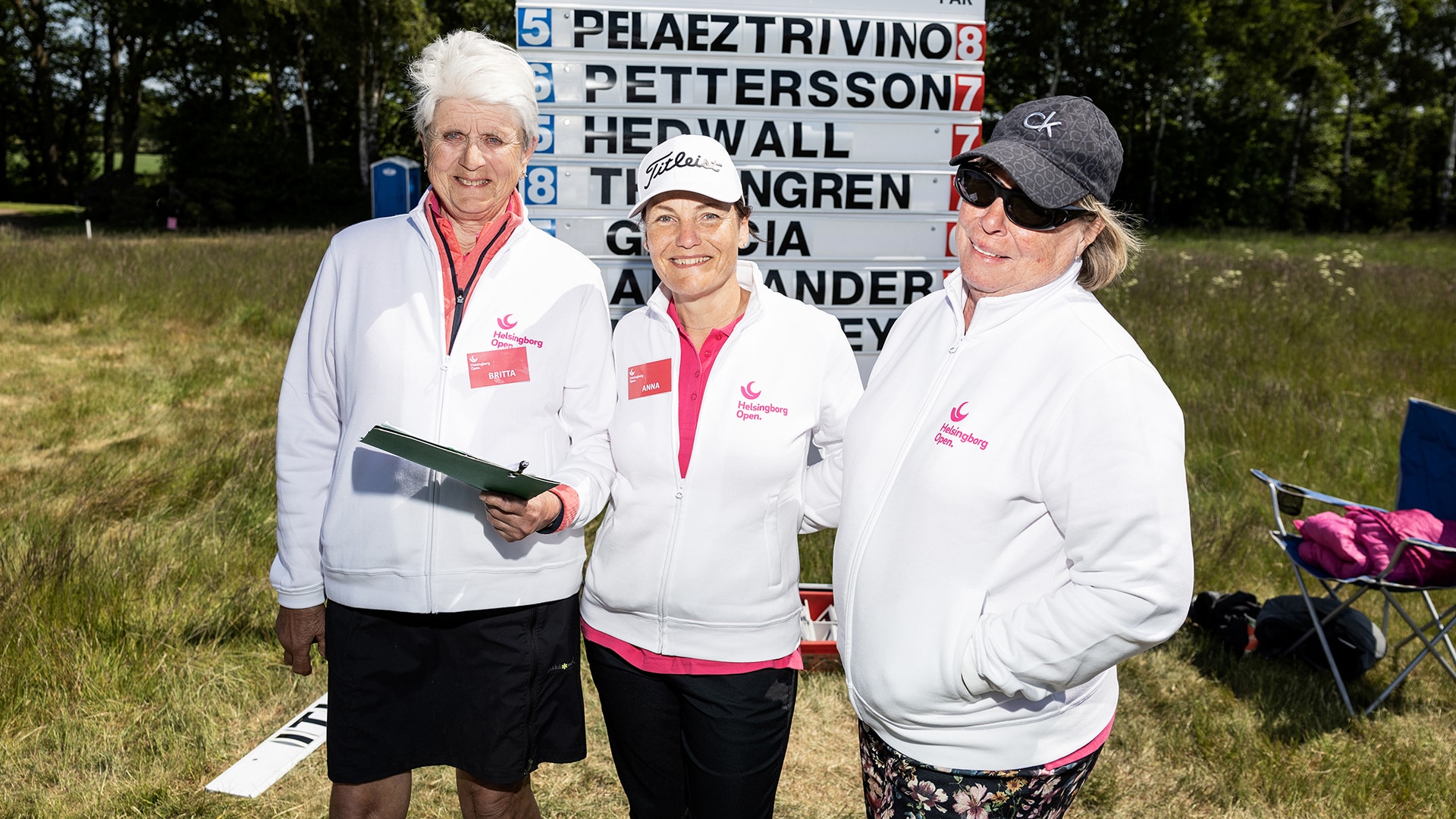 Golfkompisarna Britta, Anna och Gunvor sköter resultattavlan vid 15:e hålet – de är lite extra glada över att få sätta svenska namn i topp. Bästa maten har de också koll på.