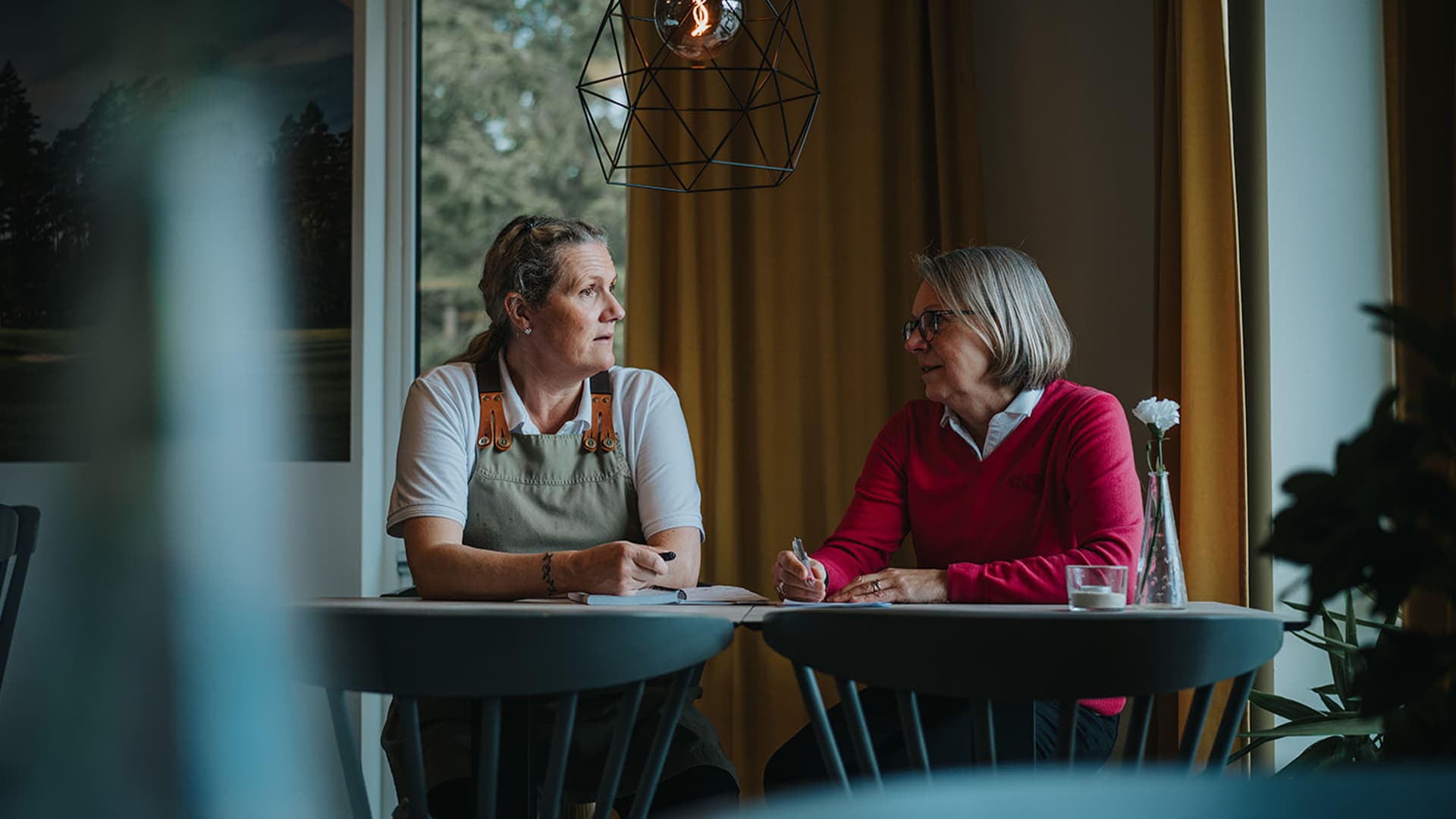 Krögaren Lotta informerar Lena om veckans bokningar.