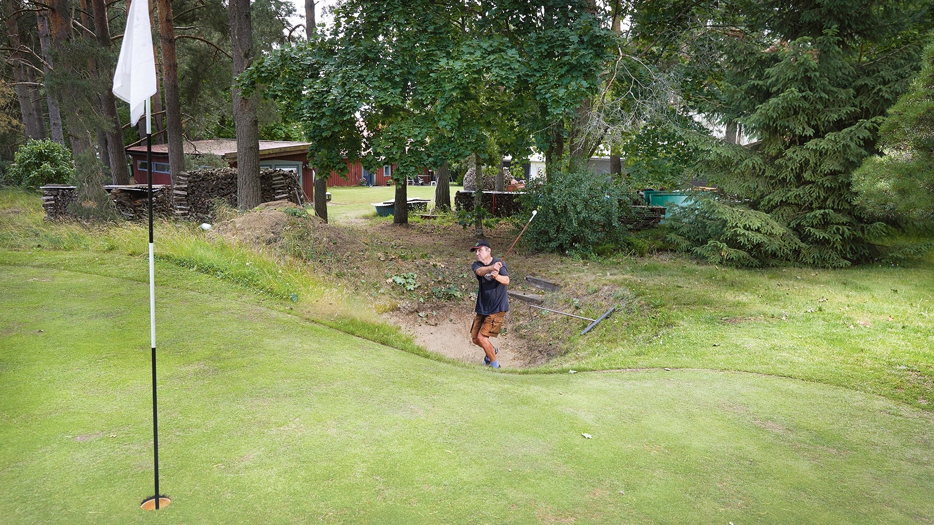 – Jag bestämde mig för att gräva en bunker på tomten och så klippte upp en liten gräsplätt för att ha något att sikta på. Det var inga problem. Marken ligger på en sandås så underlaget är perfekt.