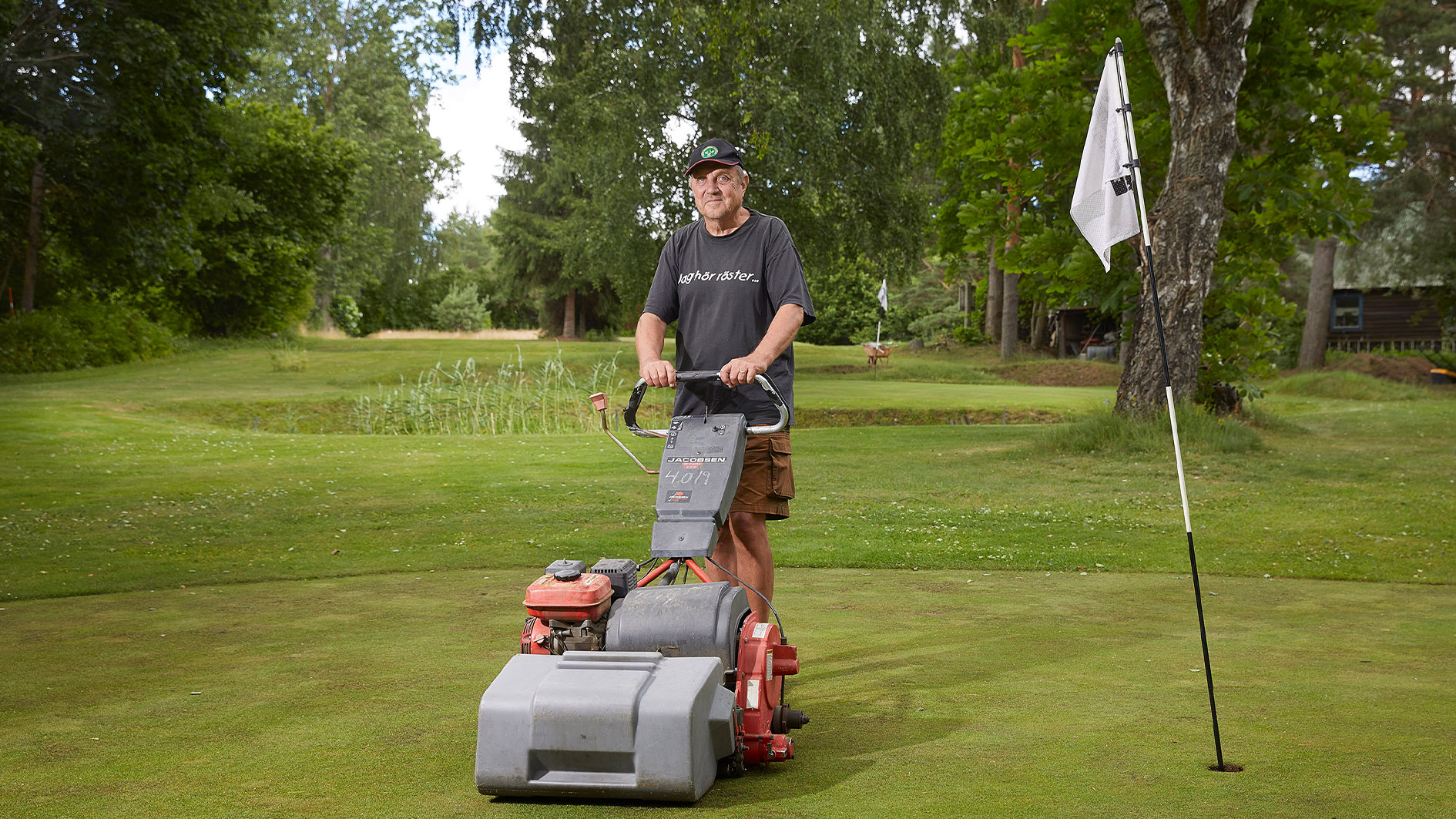 – Den kräver mycket skötsel. Skötsel är färskvara och ska den vara i toppskick får jag nog lägga 25–30 timmar i veckan. Maskinparken är liten men funktionell. Jag lyckades få tag på en begagnad Toro singelklippare, jag har en vertikalskärare och har också byggt ett borstaggregat. Greenerna handluftar jag.