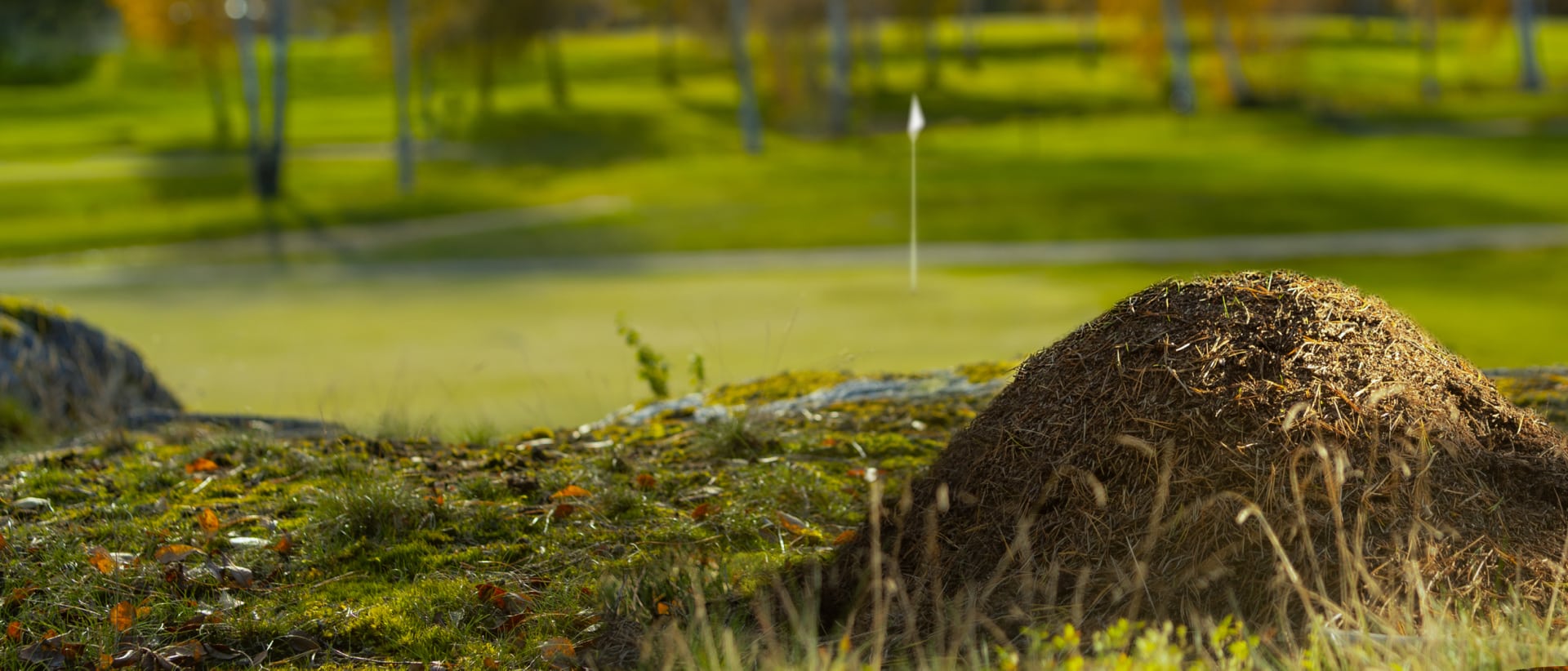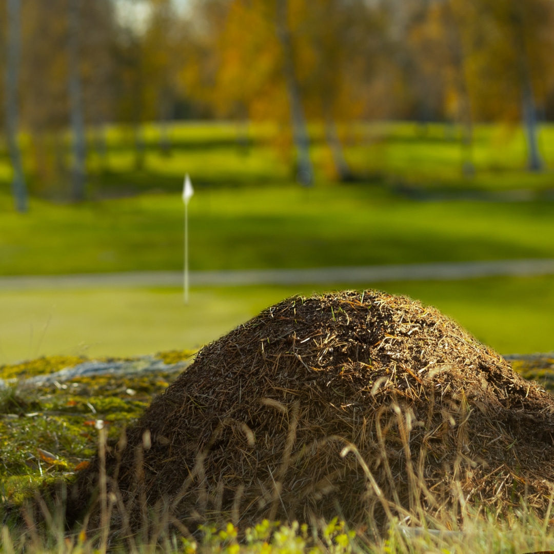 Myrstackar: Räknas som lösa naturföremål och får tas bort enligt Regel 15.1. Men, myror gör stor nytta i naturen och ibland kan myrstacken också vara mycket stor/hård varför en lokal regel kan införas så att den definieras som mark under arbete.