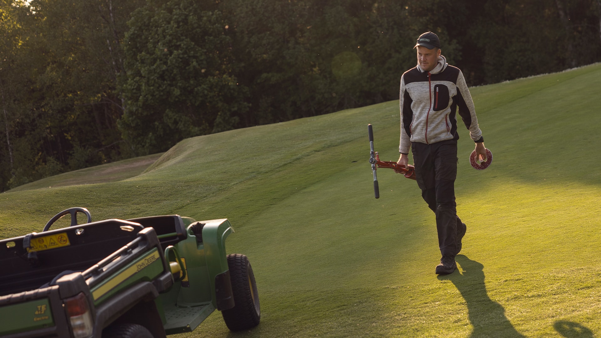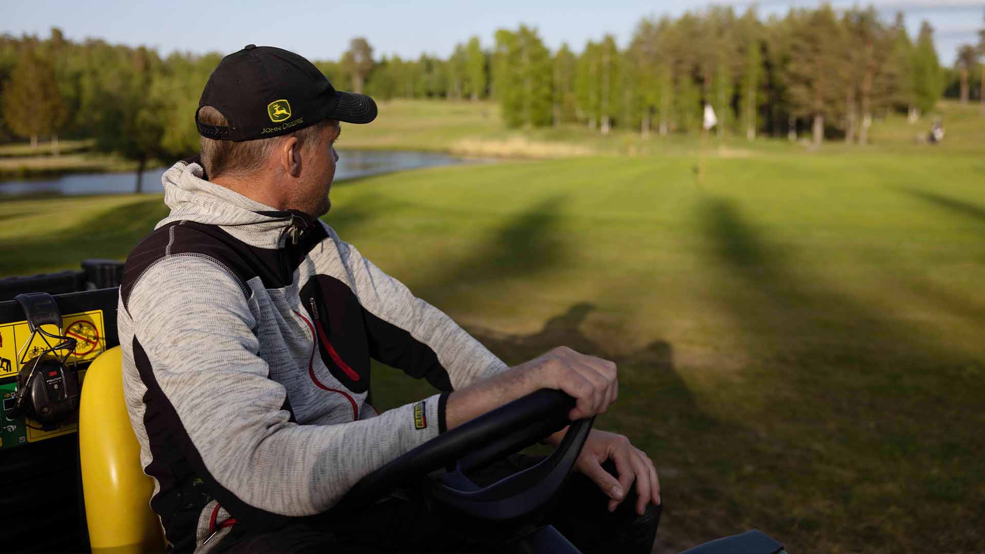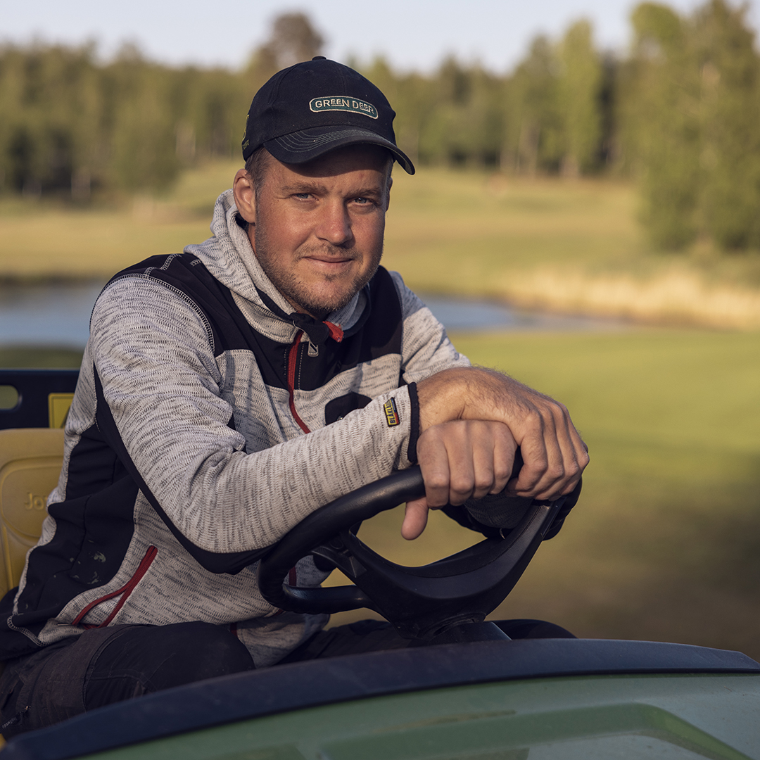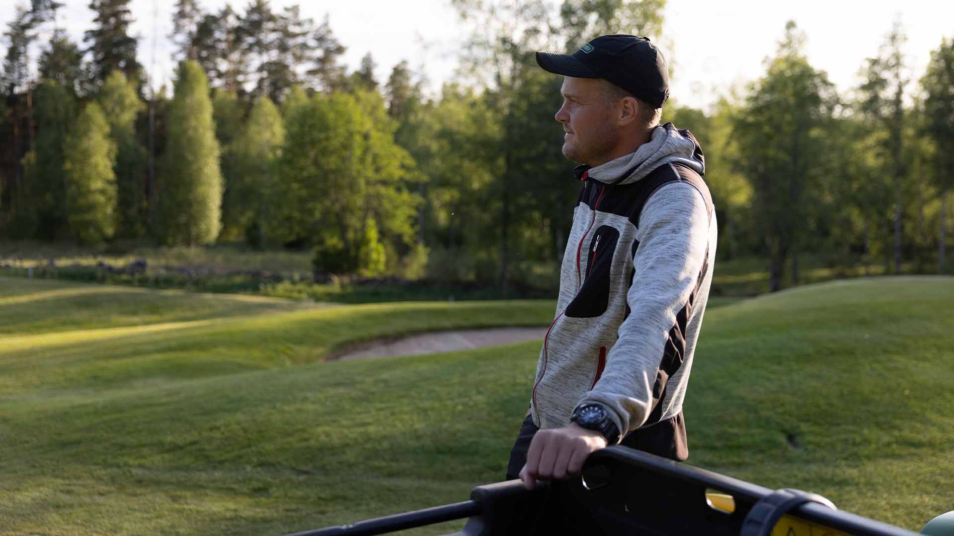 Erik Carlo, Course Manager på Nässjö Golfklubb i Småland, ser ut över sin gröna arbetsplats. Erik, som hade tänkt bli bilförsäljare, fastnade för yrket när han sommarjobbade på en annan golfklubb och har inte ångrat sig.