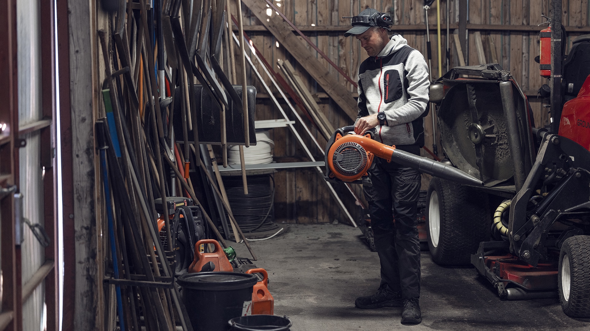 I maskinhallen finns såväl avancerade gräsklippare som mer manuella verktyg som hjälper Erik att hålla banan i toppskick.