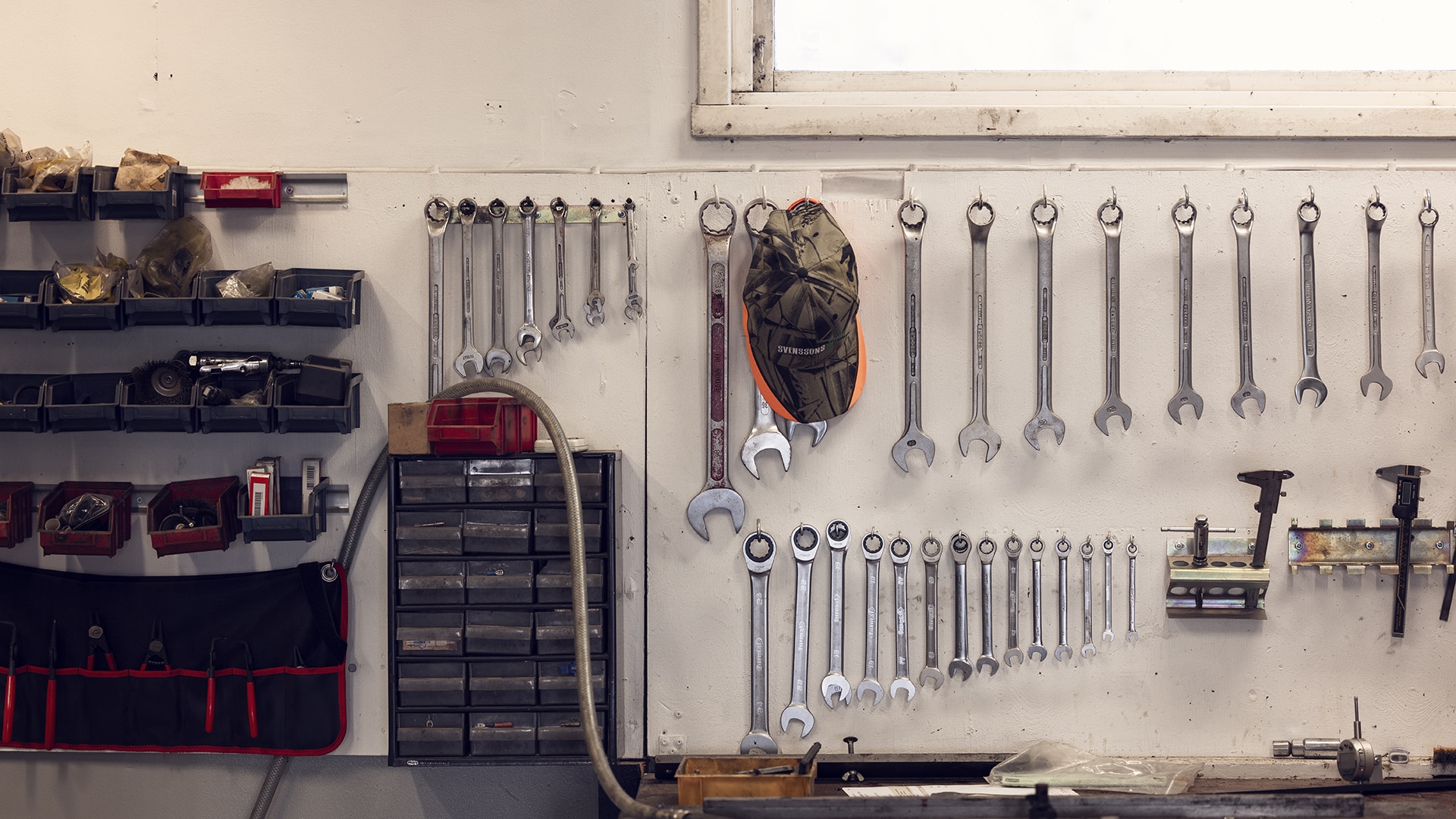 Inne hos klubbens mekaniker är det ordning och reda bland verktygen. Maskinerna ses över regelbundet. Eriks favorit är foregreenklipparen John Deere 2500.